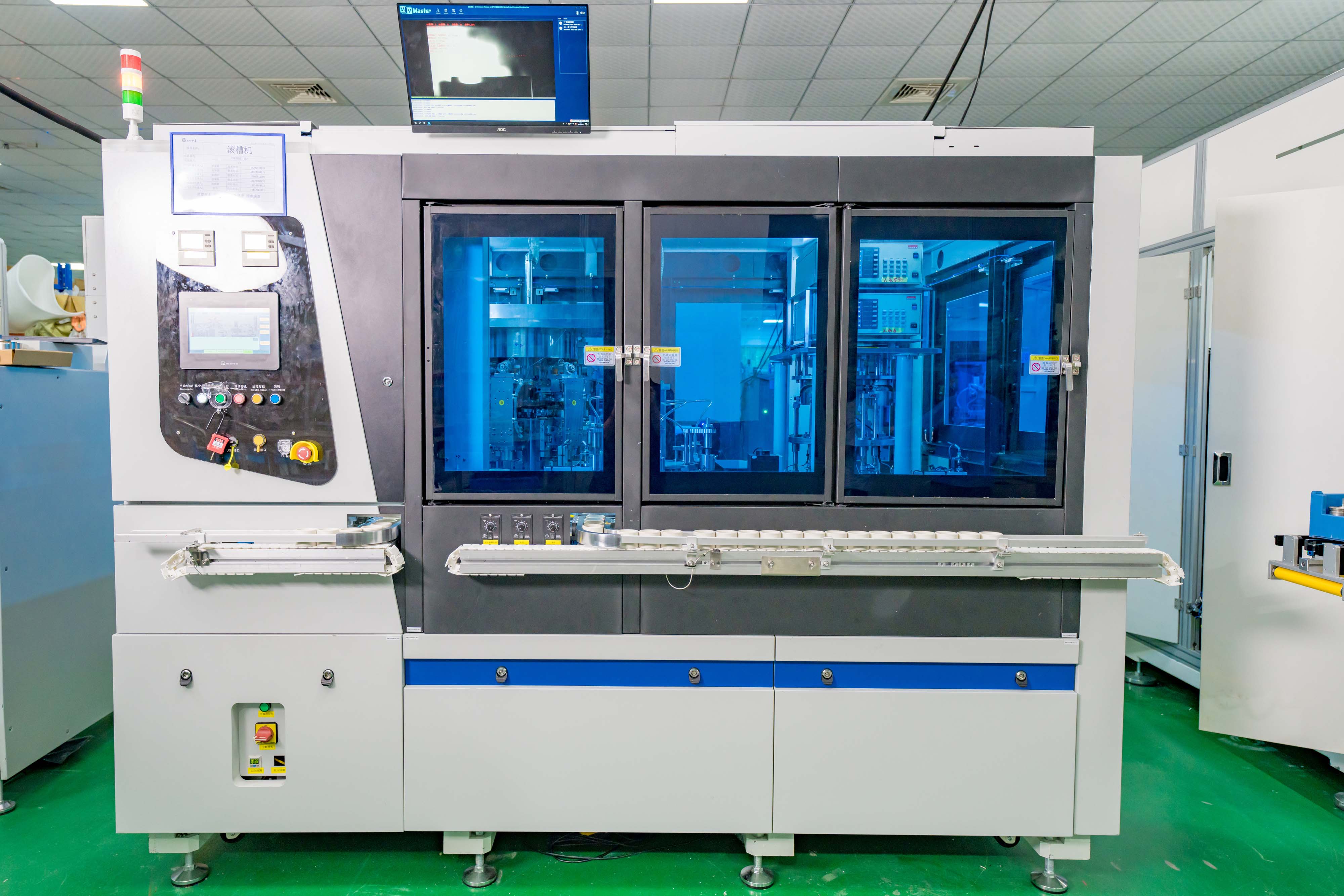 该设备为凸轮转塔式结构,通过上顶升组件和旋转下压组件双边进给挤压钢壳,在钢壳高速旋转的同时使钢壳达到一定的形变状态。电池双边进给、滚刀进给采用凸轮机构完成,在保证钢壳高精度的同时高效完成辊槽。利用基于视觉的高精度飞拍测量技术,检测成型的各项尺寸参数。
