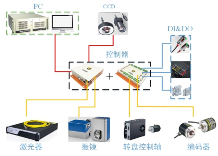 1、通过转塔结构实现转盘高速旋转,在旋转过程中,振镜系统自适应跟随转盘转动实施动态飞行焊接。