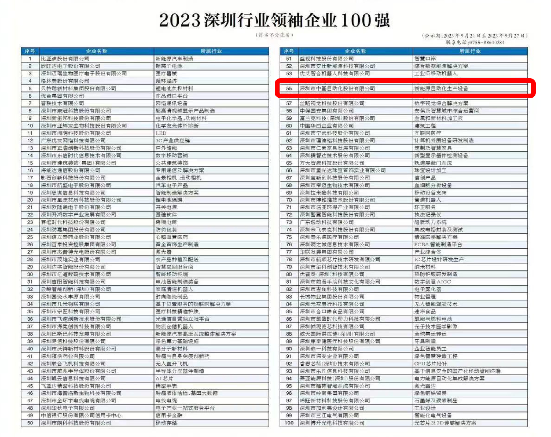 2023年9月21日,由深圳市工商业联合会(总商会)、深圳报业集团指导,深圳市行业领袖企业发展促进会与深圳商报/读创共同主办的“2023深圳行业领袖企业100强”评选结果出炉。本次“2023深圳行业领袖企业100强”评选活动历时6个月,通过多轮评审,评选出具有战略发展意义、创新引导效益的的细分行业内的领袖企业,深圳中基作为新能源自动化生产设备的行业再次荣登榜单,连续两次登上榜单是行业对深圳中基所发挥的示范带头作用的再一次认可。